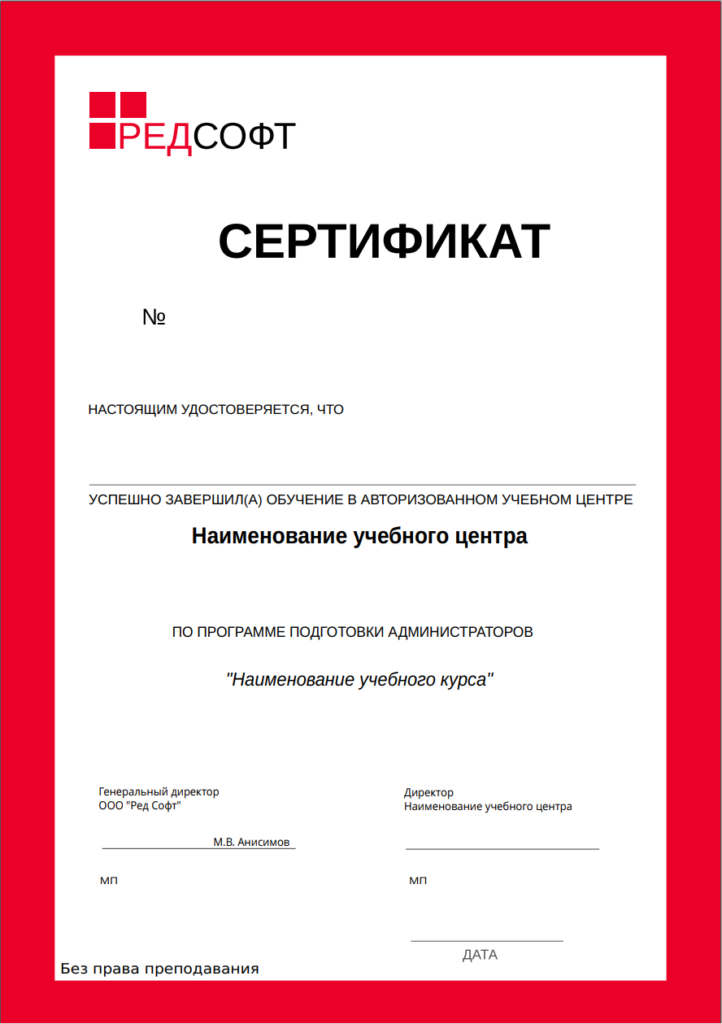 Слушателям, успешно освоившим дополнительную профессиональную программу и успешно прошедшим итоговую аттестацию, выдается сертификат РЕД СОФТ.